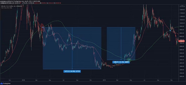 Крест смерти в истории Bitcoin — сравнительно редкое явление, но каждое возникновение паттерна было сигналом сокрушительного удара по инвесторам. Первое такое пересечение трейдеры увидели в 2018 году, когда начался длительный медвежий цикл. Цена криптовалюты на биржах упала на 52,15%.