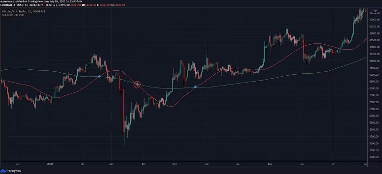 Наиболее ожидаемый крест смерти торговцы увидели 26 марта 2020 года, когда мировую экономику пошатнул COVID-19. Крупные инвесторы вывели деньги из волатильных активов и вложились в более стабильные (например, золото). Однако вскоре цена криптовалюты вновь поднялась. Начался бычий тренд.