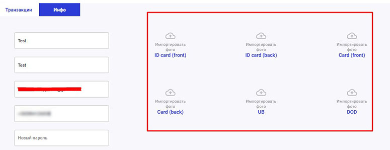 - Справа от данных пользователь увидит поля для прикрепления скан-копий документов, подтверждающих личность. Документы должны быть подлинными и актуальными, так как это гарантия безопасности аккаунта (того, что именно владелец совершает операции со своим депозитом).