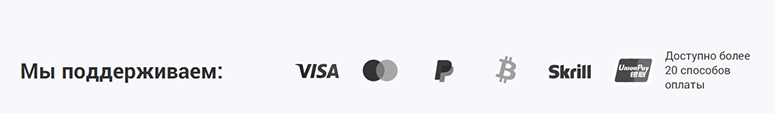 Всего доступно свыше 20 способов оплаты, включая банковские переводы, карты, электронные системы платежей и криптокошельки (последние наиболее выгодны, так как тоже не взимают комиссию).