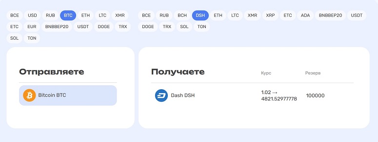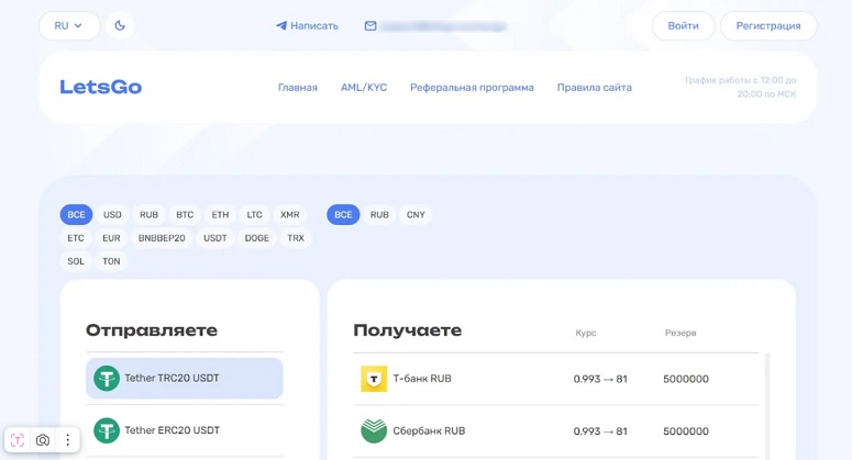 Обменник запущен в 2024 году российскими разработчиками. Letsgo Exchange поддерживает покупку и продажу наиболее востребованных криптовалют за рубли, евро, доллары и китайские юани. Также можно конвертировать одни цифровые монеты в другие.