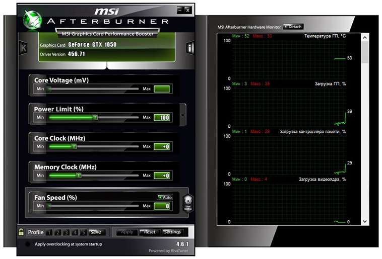 - Запустить MSI Afterburner или аналогичную программу.