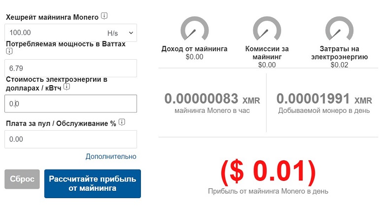 В 2024 году майнинг Monero со скоростью 100 H/s без учета затрат на электричество приносит $0,01 в день. Сумма незначительная, поэтому добыча нерентабельна.