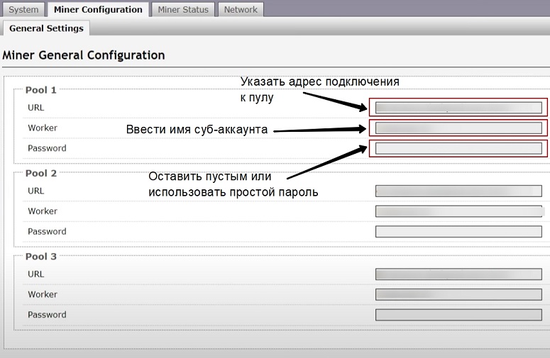 - После этого перейти в раздел Miner Configuration и выбрать General Settings. В строку URL ввести адреса пула для асика, в поле Worker — имя созданного ранее субаккаунта. Вкладку Password можно оставить пустой.