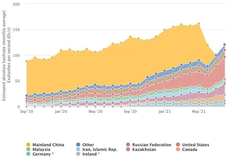 Правительство КНР запретило добычу биткоинов в мае 2021 года. Многие майнеры бежали из Китая, забрав с собой фермы. В июле 2021 хешрейт упал до нуля. Однако пользователи, у которых не было возможности покинуть страну, остались. Показатели быстро восстановились до 22,3%.