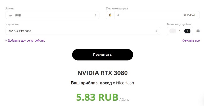 Такая конфигурация будет приносить в среднем ₽5,83 (на сервисе NiceHash). Заработок указан за вычетом расходов на электричество.