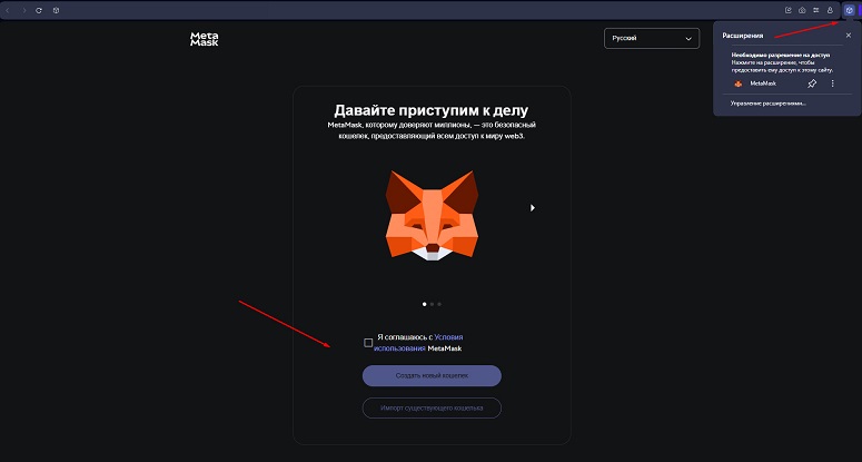 При первом запуске расширения будет предложено создать новый кошелек или импортировать ранее зарегистрированный.