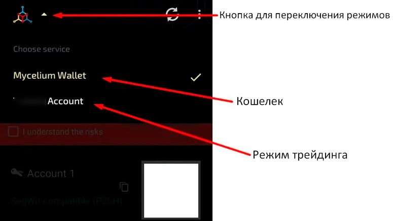 В главном меню есть кнопка для переключения в режим Trading Account. При нажатии на нее происходит переадресация на сайт криптобиржи Bequant. У этой платформы есть мобильное приложение, позволяющее торговать токенами и коинами, внося депозит с Mycelium.