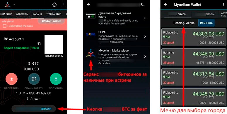 Аналогичным способом возможна покупка цифровых активов через систему банковских переводов SEPA. Кроме того, в функционале криптовалютного кошелька Mycelium Wallet есть встроенная P2P-платформа для обмена токенов и коинов на наличные. Этот тип операций проводится по следующему алгоритму: