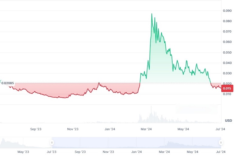 Это децентрализованная криптовалюта, которая появилась на глобальном рынке в конце минувшего года. В апреле 2024-го котировки монеты достигли уровня ATH на отметке $0,204. Однако с того момента последовала глубокая просадка.