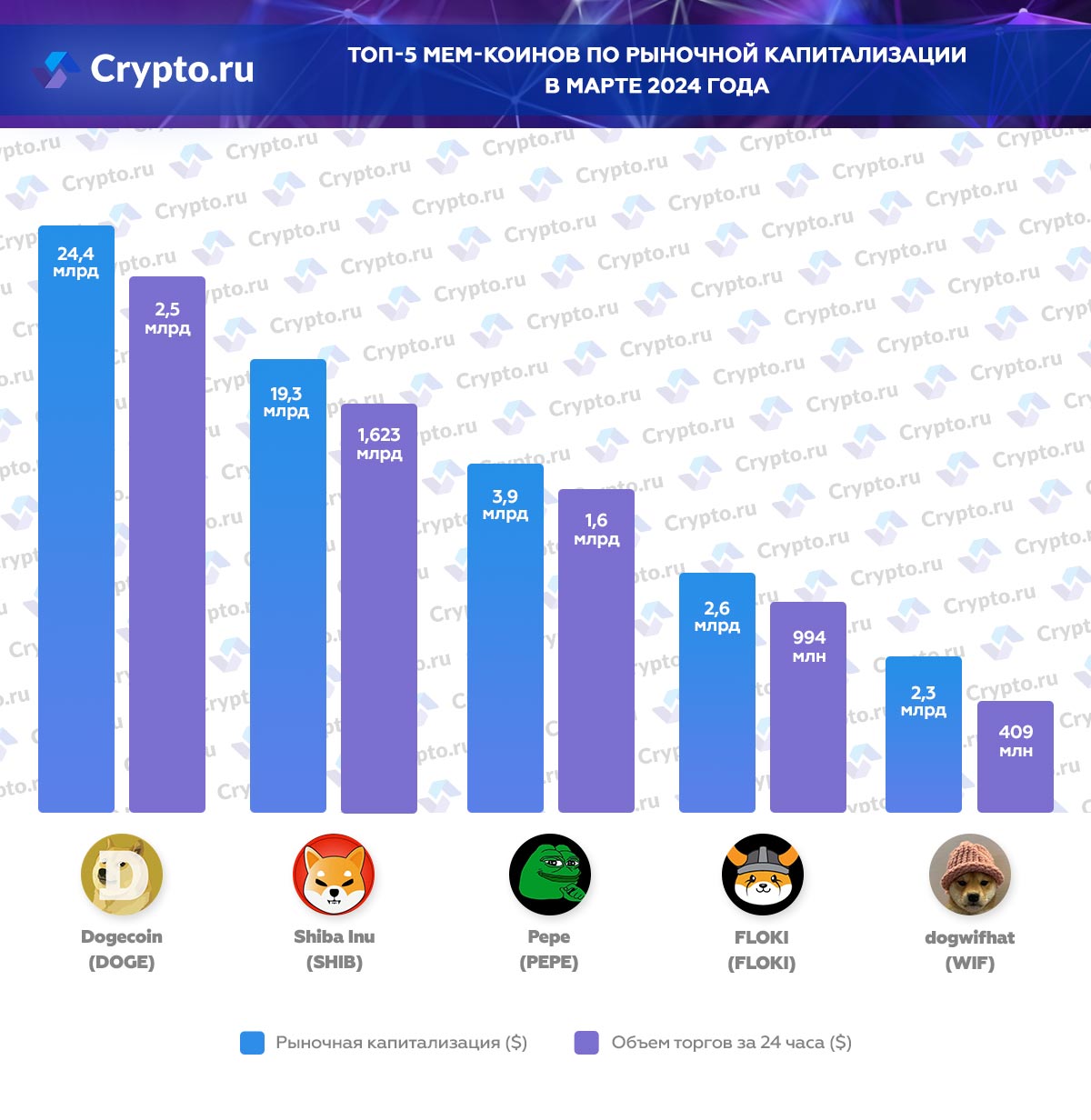 Топ-5 мем-токенов по рыночной капитализации в марте 2024 года