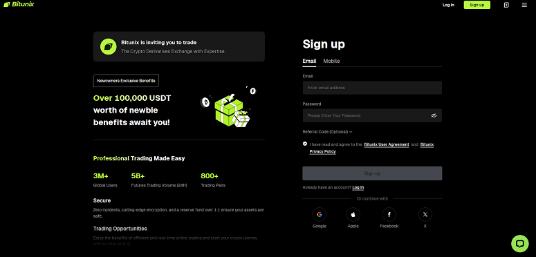 - Создать аккаунт или войти в учетную запись на Bitunix. Нужно открыть сайт площадки и зарегистрироваться, используя свой адрес электронной почты и надежный пароль. Пользователи, ранее создавшие учетную запись, могут войти в пару кликов.