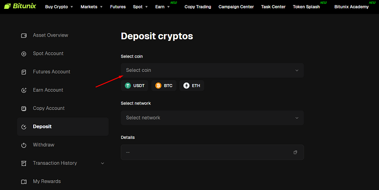- Пополнить счет. Нужно нажать на кнопку «Кошелек», расположенную в правом верхнем углу. Затем необходимо кликнуть по клавише «Депозит» и указать криптовалюту, например USDT.