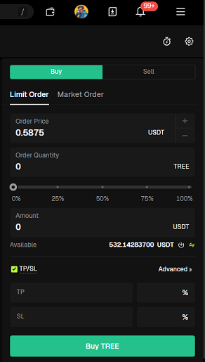 - Оформить заказ. После того как пользователь выбрал TREE, нужно задействовать рыночный ордер (покупка совершается немедленно по текущей стоимости) или лимитный ордер (есть возможность установить желаемую цену). Останется ввести сумму сделки и нажать на кнопку «Купить TREE».