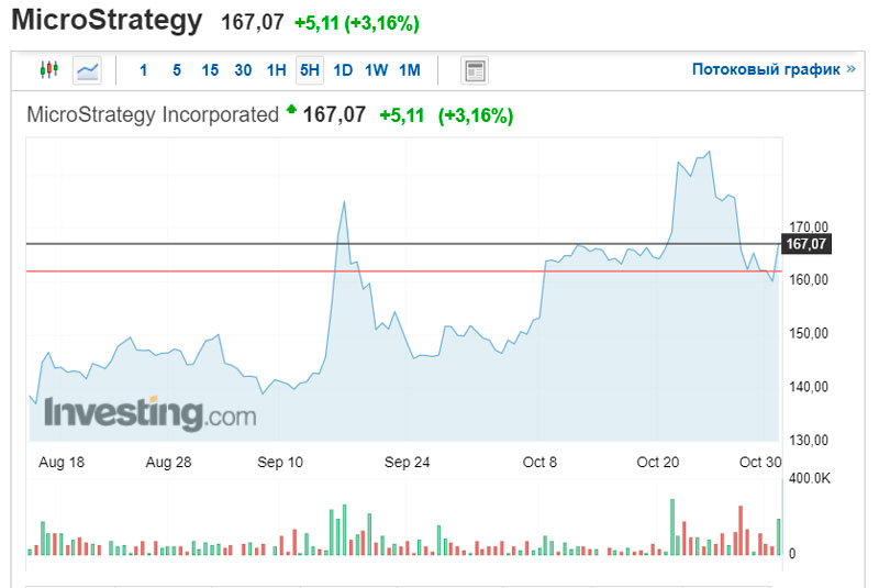 В сентябре состоялась повторная покупка криптовалюты и новый рост ценных бумаг на 11% при потерях Microsoft и Apple в размере 4.6% и 6.75%. Объем инвестиций компании в биткоин увеличился до $450 млн.