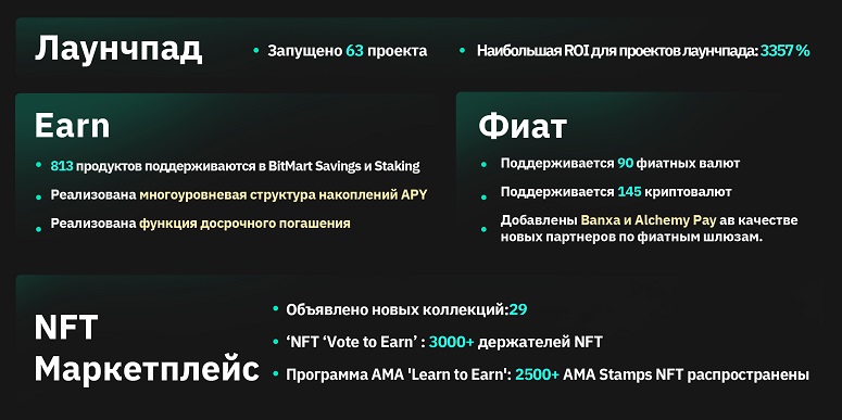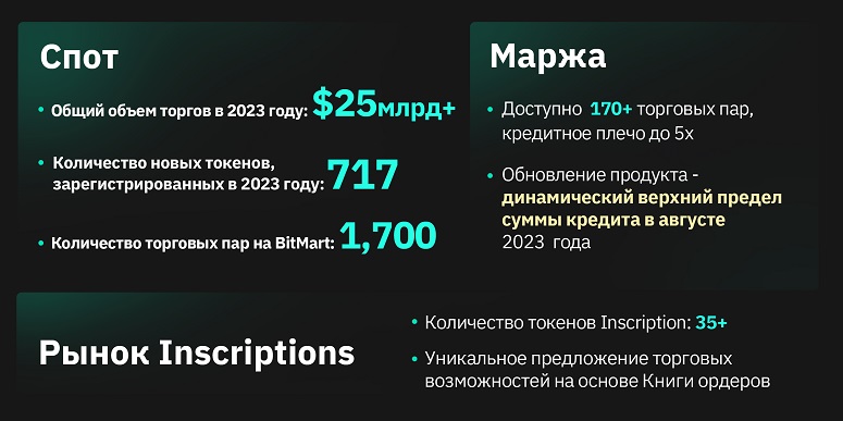 В 2023 году операционный ландшафт BitMart стал яркой витриной расширения и инноваций. От оживленной торговли на спотовом и маржинальном рынках до новаторских достижений на рынке Inscriptions — наша платформа превратилась в бастион возможностей, удовлетворяя разнообразные потребности трейдеров с помощью передовых решений. Внедрение уникального предложения торговых возможностей на основе книги ордеров для Inscriptions стало ярким событием, отражающим суть нашей миссии по улучшению торгового опыта благодаря точности и профессионализму. Этот шаг стал воплощением нашей приверженности росту и обслуживанию, ознаменовав год, в котором каждая операционная грань была переплетена с нитью совершенства.