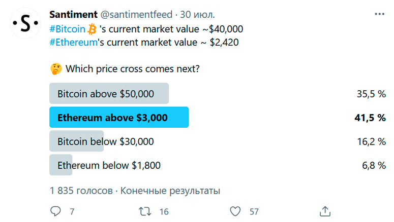В исследовании приняли участие 1 800 человек. Им предлагалось выбрать, какое из 4 событий на криптовалютном рынке произойдет раньше. За рост биткоина до $50 тыс проголосовали 35,4% опрошенных, а за его падение ниже $30 тыс — 16,2%. Эфириум-сообщество настроено более позитивно: в увеличение курса монеты до $3 000 верит 41,5% подписчиков Santiment. Лишь 6,8% считают, что вторая по капитализации цифровая валюта упадет до отметки в $1 800.