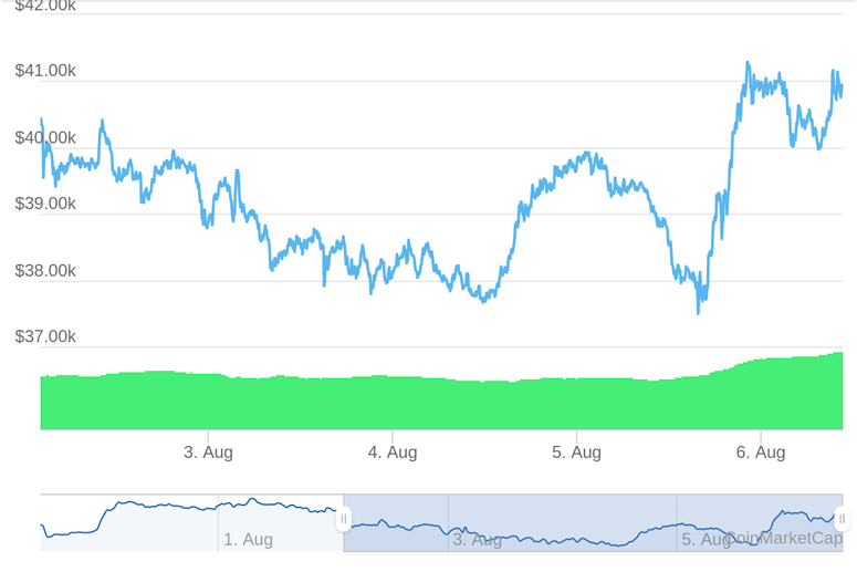 Первая криптовалюта за несколько часов 5 августа подорожала на 10%. На пике курс биткоина пробил отметку в $41,3 тыс. Сейчас цена 1 монеты составляет $40,8 тыс. цифрового золота выросла на 4,91% и составляет $769,72 млрд.