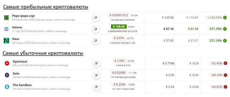 - Самые убыточные цифровые монеты: Optimism (-9,24 USDT), Gala (-6,92 USDT), The Sandbox (-6,66 USDT).