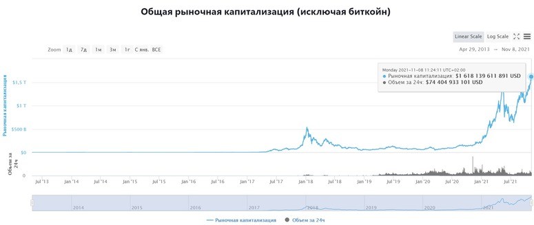 Рыночная альткоинов (все криптовалюты, кроме биткоина) 8 ноября 2021 года достигла максимального значения за всю историю (All Time High, ATH). По данным CoinMarketCap, в 12:24 (МСК) она составила $1,61 трлн. Торговый объем за 24 часа — $74,4 млрд.