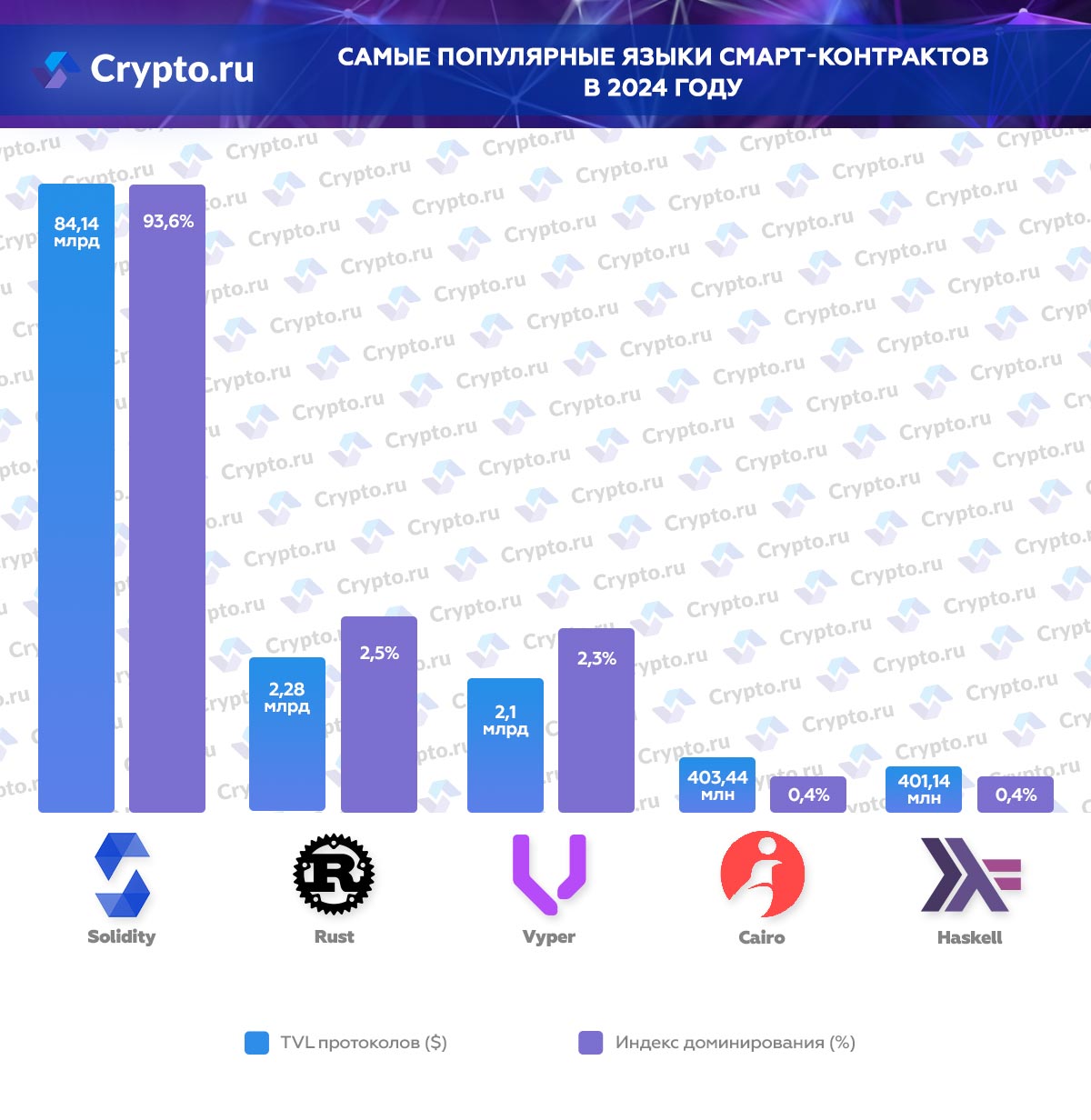 В топ-5 самых популярных языков смарт-контрактов в 2024 году также вошли: