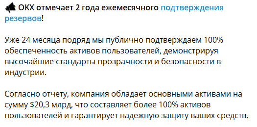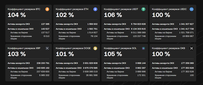 Так, в 24-м отчете подтверждения резервов криптобиржи OKX содержатся данные о резервах для 22 цифровых монет на общую сумму $20,3 млрд. Величина обеспечения пользовательских активов выросла на 5% с $19,3 млрд в сентябре 2024-го. Коэффициент по каждому из них превышает 100% и в некоторых случаях достигает 106%.