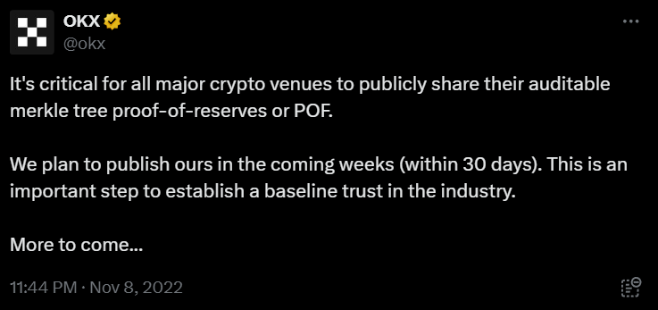 «Для всех основных криптоплощадок критически важно публично поделиться своими проверяемыми доказательствами резервов Merkle Tree или PoF. Это важный шаг для установления базового уровня доверия в отрасли», — сообщили представители криптобиржи OKX, которая одной из первых запустила платформу для демонстрации собственных резервов 24 ноября 2022 года.