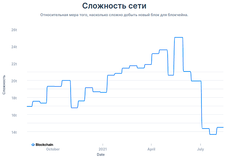 В начале июля сложность майнинга Биткоина снизилась на 27,9% по сравнению с июньским значением: с 19,9 TH в секунду общая скорость хеширования упала до 14,4 TH/с. В середине месяца произошла небольшая корректировка до 13,7 TH/с — самого низкого значения с середины июня 2020 года. На данный момент показатель вернулся к значению на начало прошлого месяца.
