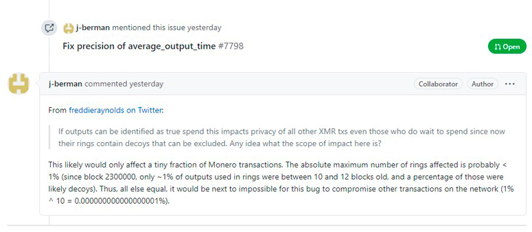 В блокчейне Monero используются кольцевые подписи блоков. В этой технологии связываются воедино входы и выходы не имеющих отношения друг к другу транзакций. Разработчики блокчейна называют эту технологию «приманкой». Уязвимость была обнаружена программистом Джастином Берманом 27 июля. Баг в алгоритме приманки мог деанонимизировать отправителя транзакции в случае, если он потратит криптовалюту в течении 20 минут после ее приобретения.
