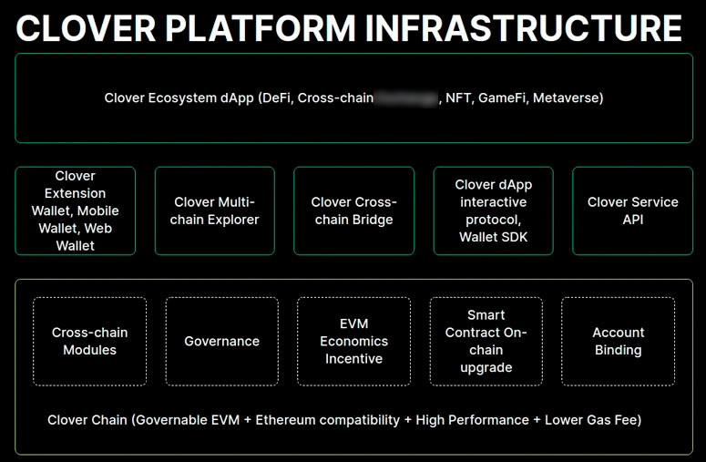 Возможно подключение к разным децентрализованным приложениям. В системе работает криптовалюта CLV. Это монета, которая реализована на 2 блокчейнах — собственном Clover и Polkadot. Используется механизм достижения консенсуса Merkle proof of inclusion.