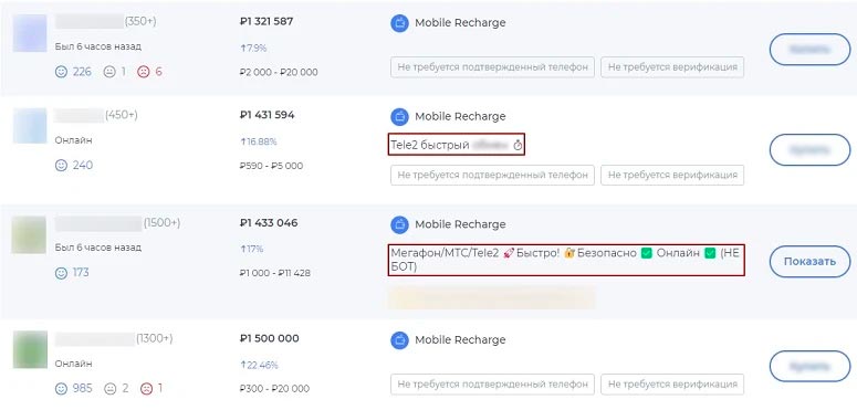 - Выбрать метод оплаты «Пополнение мобильного». Прямое направление Tele2 на сайтах не представлено. Название нужного оператора контрагенты пишут в описании к предложению.