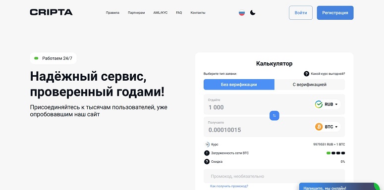 Сервис функционирует в полуавтоматическом режиме. Заявки обрабатываются 24/7. С техподдержкой можно связаться в любое время. Постоянные клиенты получают скидки на обмен и могут участвовать в партнерской программе.