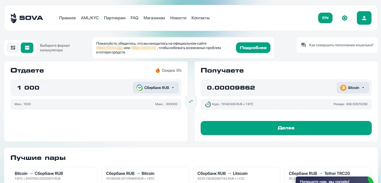 Сервис Sova поддерживает сотни обменных направлений. Текущий резерв средств на платформе составляет $830,4 млн. Курс плавающий, меняется каждые 30 секунд. Это позволяет покупать и продавать криптоактивы по актуальным рыночным ценам. Сервис берет за сделки небольшую комиссию (3-5%), которая включена в курс.