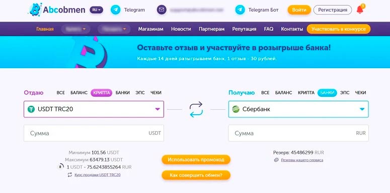 Обменник зарегистрирован в Эстонии. За годы работы сервиса пользователи оставили о нем тысячи положительных отзывов. На сайте ABCObmen можно обменять любые суммы. Минимальный порог транзакции — 100 USDT в эквиваленте, максимальный — 64 тыс. USDT. Лимит можно увеличить по запросу.