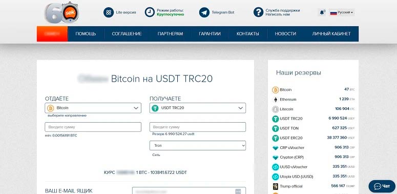Обменный сервис создан и зарегистрирован в России в 2017-м. За годы работы его положительно оценили более 10 тыс. клиентов. Сайт 60cek поддерживает тысячи направлений для сделок, включая обмен криптовалют между собой, покупку и продажу за фиат.
