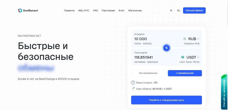 Обменять криптовалюту можно только на официальном сайте. Мобильного приложения нет, но интерфейс адаптирован под все популярные платформы. OneMoment поддерживает 35 цифровых валют и 1500 направлений для сделок. Для расчетов используются рубли, доллары, гривны, тенге, баты. Также доступна покупка криптовалюты за наличные в Москве.
