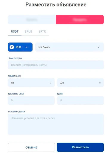P2P-площадка запущена в январе 2023 года. Разработчики постоянно улучшают интерфейс, добавляют новые инструменты. В июле 2024 года пользователи могут покупать и продавать стейблкоин USDT, а также нативные токены BRTR, BRUB. Для оплаты доступны RUB и USD. Чтобы разместить объявление на приобретение или продажу криптовалюты, нужно: