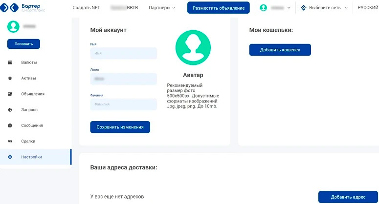 - После автоматического входа в панель управления можно изменить настройки — добавить имя, фамилию, аватар, внести адрес доставки. Также получится выбрать валюту интерфейса. Адрес кошелька появится в списке после подключения.
