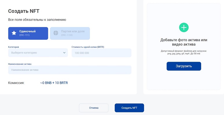 - Заполнить форму. Необходимо выбрать стандарт NFT (ERC-721 или ERC-1155). Далее потребуется отметить категорию актива. Они есть в выпадающем списке. Также нужно указать цену в BRTR и количество копий для ERC-1155.