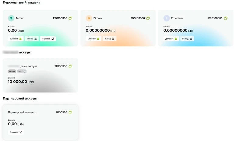 В личном кабинете можно управлять торговыми счетами (пополнять, снимать, переводить средства). В разделе «Дашборд» отображается статистика персонального аккаунта. На момент подготовки обзора можно отслеживать информацию по криптовалютным счетам. В ближайшее время будут добавлены общая статистика и аналитические графики. Эти модули находятся в разработке.