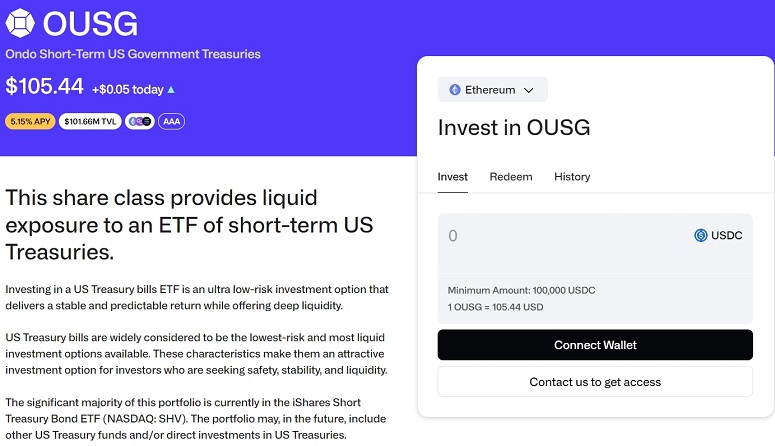 Компания предлагает инвесторам несколько продуктов. Первым финансовым инструментом, добавленным на платформу, были Short-Term US Government Treasuries (OUSG) — краткосрочные казначейские облигации США. Они управляются крупными организациями Blackrock и PIMCO.
