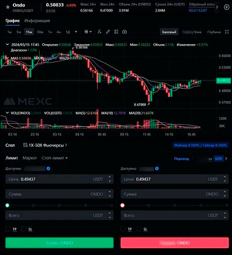 - В торговом терминале указать количество ONDO или сумму в USDT.