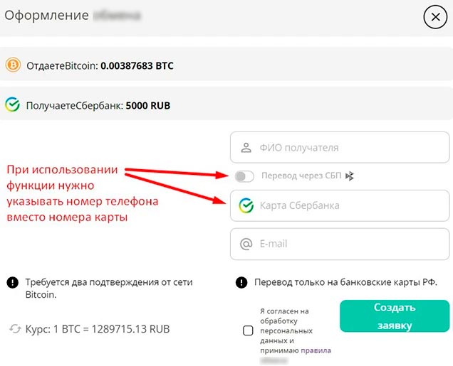 При выборе направлений обменов формата «криптовалюта — российский банк» клиенты могут применять функцию «Перевод через СБП». Но тогда вместо номеров карт пользователям нужно будет указывать свои телефоны.