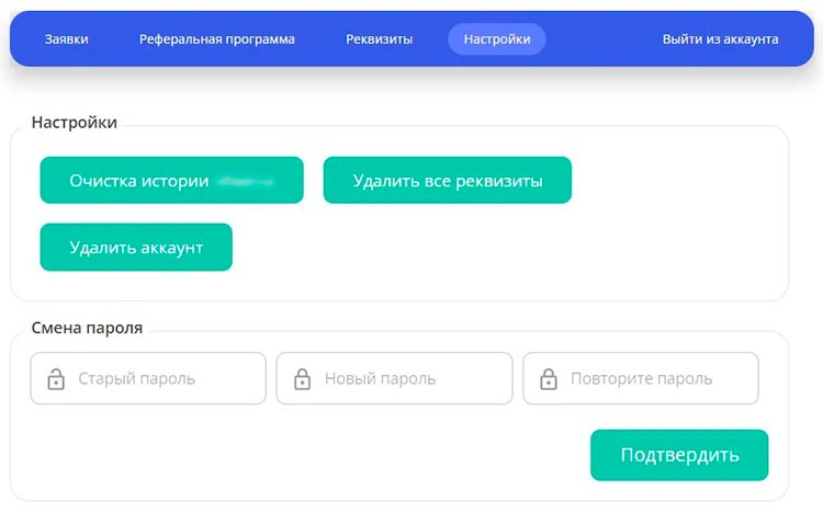 - «Настройки». На странице можно удалить истории операций, реквизиты, аккаунт. Также во вкладке есть опция смены пароля.