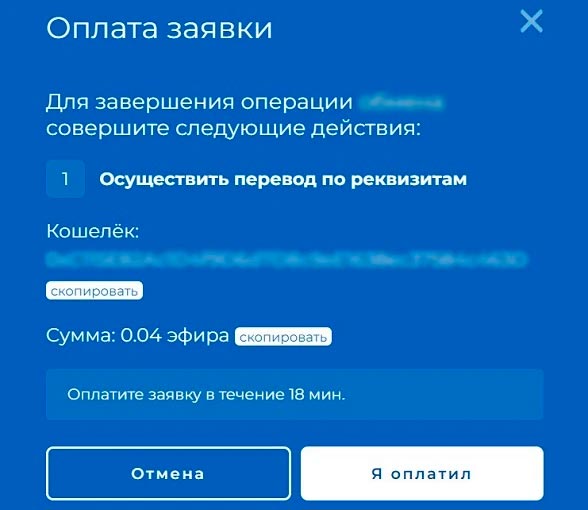 - Оплатить заявку по Ethereum реквизитам из загрузившегося окна в течение 18 минут. Если не успеть, обменный запрос будет закрыт.