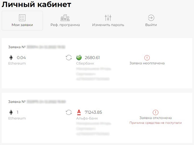 - «Мои заявки». На странице отображается список всех созданных обменных запросов. Здесь в формате таблицы пользователи могут отслеживать номера заявок, даты с точностью до минуты, платежные реквизиты платформы и собственные, статусы обменов.