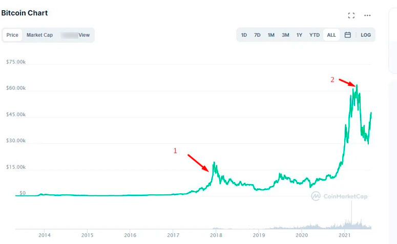 Для выявления предпосылок и причин увеличения стоимости первой криптовалюты аналитики изучают события двух периодов, когда у BTC фиксировали исторические максимумы. Первое значительное увеличение курса произошло в 2017 году. Был поставлен рекорд в $19 783 за 1 монету. Второй скачок произошел в 2021 году.