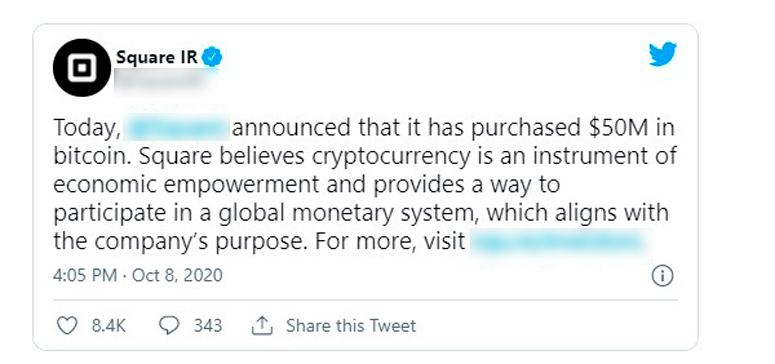 - Платежная фирма Square инвестировала $50 млн. Владелец назвал монету инструментом, который дарит новые экономические возможности и открывает доступ к глобальной системе финансов. Ранее от CEO Джека Дорси уже поступали заявления, что BTC однажды станет единственной монетой, используемой в сети.
