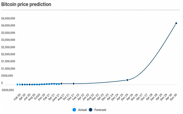 - Согласно опросу экспертов (работников финансовой сферы, ученых, институциональных инвесторов), монета недооценена. Она дорожает, но медленно. К концу 2021 г. курс должен достичь $66 284. А с 2022 г. по 2025 г. они ожидают постепенного подъема до $318 000.