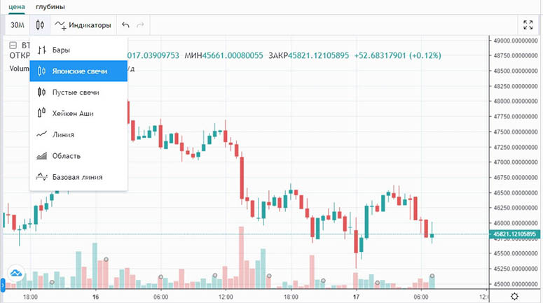В середине торгового терминала размещен график, импортируемый с портала TradingView. В него встроены все функции, которые должны быть знакомы пользователям этого ресурса. График имеет много настроек и инструментов, помогающих анализировать курс выбранной криптовалюты.